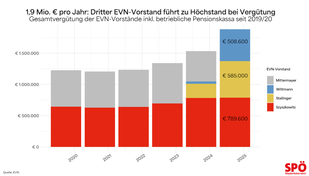 Zum Vergleich: Zwei Jahre zuvor lagen die Gesamtkosten ohne dritten Vorstandsposten bei etwa 1,5 Millionen Euro. Das entspricht einer Steigerung von rund 26 Prozent. Die SPÖ Niederösterreich forderte bereits 2023 eine Halbierung der EVN-Vorstandsgehälter. In Zeiten der Teuerung habe ein weiterer EVN-Vorstandsposten keine Berechtigung, übte SPÖ-NÖ Kontroll-Landesrat Sven Hergovich Kritik.